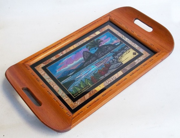 • Bandeja em marchetaria e asa de borboleta representando a baia de Guanabara. Medindo: 4 x 24 cm.