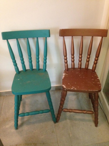 • Duas cadeiras em madeira maciça, estilo  country. Medindo: 83 x 40 cm. Necessita renovar a pintura.