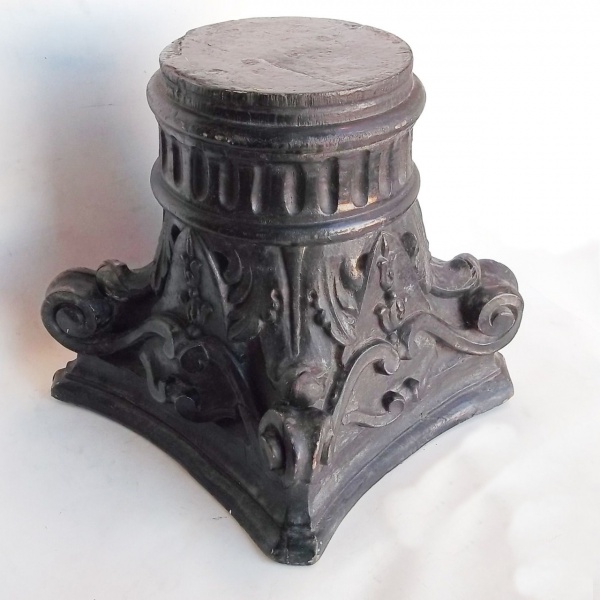 • Grande peanha em madeira nobre ornada com volutas. Medindo: 33 x 33 x 20 cm.