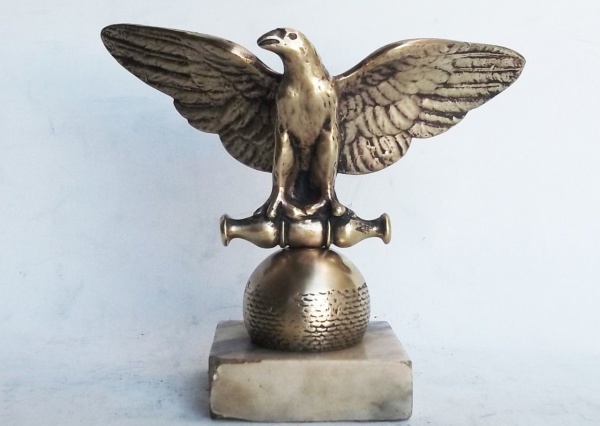 • Escultura em bronze representando águia com base em mármore. Medindo: 16 cm.