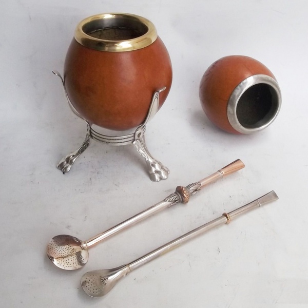 • Duas cuias, duas bombas e suporte para chimarrão, uma bomba marcada prata e outra marcada alpaca.