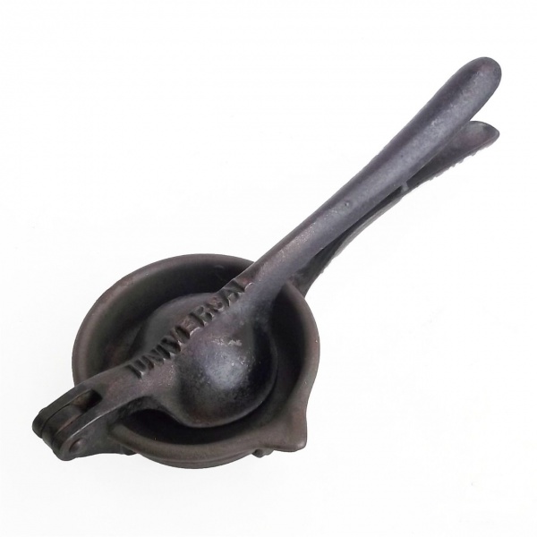 • Antigo espremedor americano universal. Corpo em ferro fundido. Por volta de 1920. Medindo: 25 cm e aberto 50 cm.