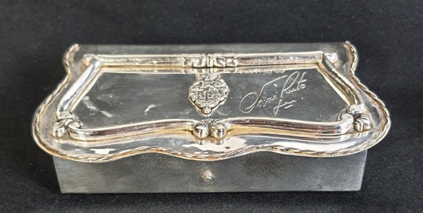 • Caixa porta joias em metal prateado. Assinatura na tampa. Medindo: 4 x 15 x 9 cm.
