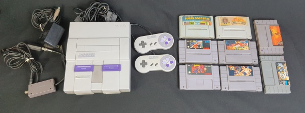 • Super Nintendo Entertainment System - Console de vídeo Game, modelo NO.SNS-001. Medindo: 24 x 20 cm. Acompanham 2 controles e  8 jogos. Funcionamento desconhecido.