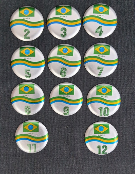 • Jogo Futebol de Botão / Mesa - Brasil, 11 peças, em alumínio. Medindo: 4 cm.