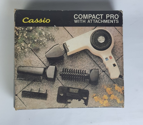 • Cassio - Antigo secador  de cabelo " compact pro whit attachments". Caixa original. Medindo: 19 x 18 X 5,5 cm e 14 X 5 cm. Ligando