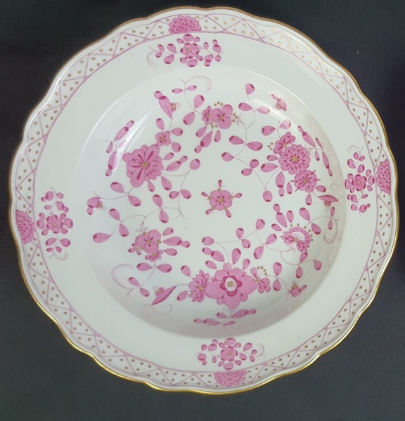 • Meissen - Prato fundo em porcelana alemã, da manufatura de Meissen, esmaltado na cor rosa, com detalhes de ouro, sobre fundo branco e bordas onduladas. Medindo: 5,5 x 24 cm.