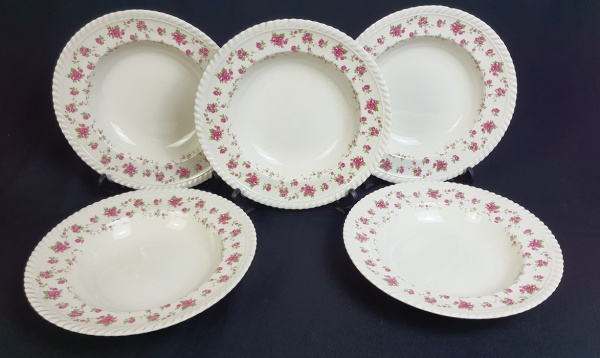 • Johnson Bros - Cinco pratos fundos em faiança inglesa bordas com decoração floral. Medindo: 4 x 23 cm.