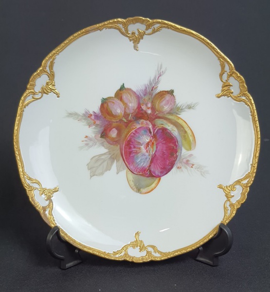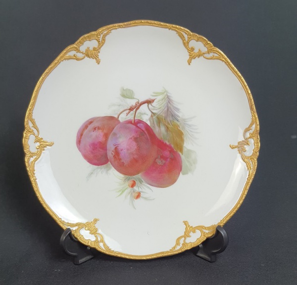 • KPM - Antigo prato de coleção em porcelana polonesa, esmaltado com frutos ao centro e bordas com rica douração em alto relevo. Medindo: 22 cm.