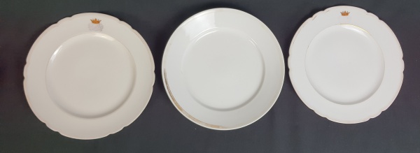 • Três pratos em porcelana Breul à Paris, século XIX, brasonado, na cor branca com fio de ouro. Medindo: 23 cm. Apresenta desgastes.