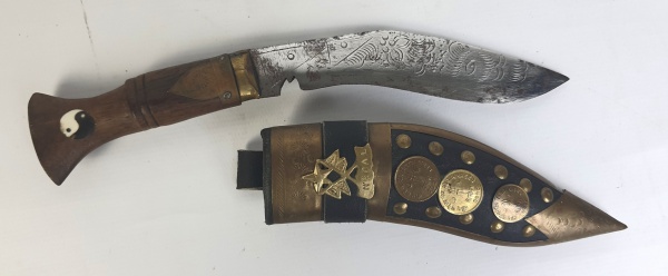 • Cutelaria - Faca Kukri de caça / guerra, em aço, punho em madeira, com bainha em couro e metal dourado `Nepal`. Medindo: 24 cm.
