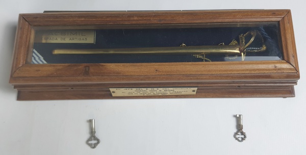 • Cutelaria - Espada de artigas, em estojo ` EL JEFE DEL E.M.E. DEL URUGUAY - GENERAL HUGO M. MEDINA - AL JEFE DE DEP. DE ENSINO Y PESQUISA - GEN. EX. GERALDO ALVARENGA NAVARRO, 8 OCTUBRE 1981`, acompanha 2 chaves. Medindo: 23 cm, estojo: 5 x 31 x 10 cm.