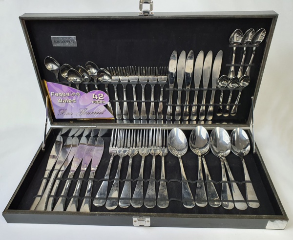 • Faqueiro Wales - Bon Gourmet - Composto de 42 peças, sendo: 6 facas de mesa, 6 facas de sobremesa, 6 garfos de mesa, 6 garfos de sobremesa, 6 colheres de sopa e 6 colheres de chá acondicionado em estojo original.