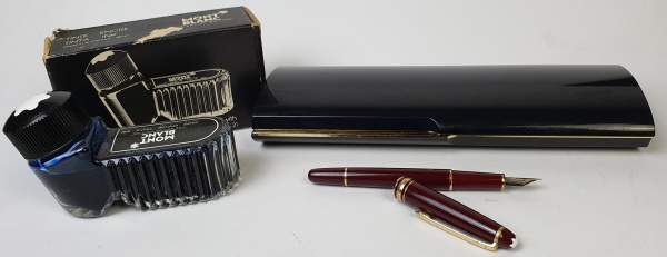 • Vidro com tinta Mont Blanc (aberto), acompanha estojo e caneta tinteiro (autenticidade não atestada) .