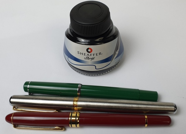 • Três canetas tinteiro diversas e vidro com tinta Sheaffer.