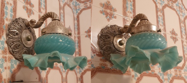 • Par de arandelas em metal prateado com cúpula em opalina azul . Medindo aproximadamente: 20 x 20 cm