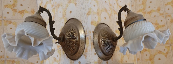 • Par de arandelas em metal prateado com cúpula em opalina branca. Medindo aproximadamente: 20 x 20 cm
