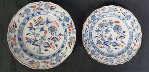 • Meissen - Dois pratos em porcelana alemã, da manufatura de Meissen, esmaltado na cor azul, decorado com fios de ouro, sobre fundo branco, do padrão dito Cebolinha e bordas onduladas. Medindo: 17,5 cm e 19,5 cm.