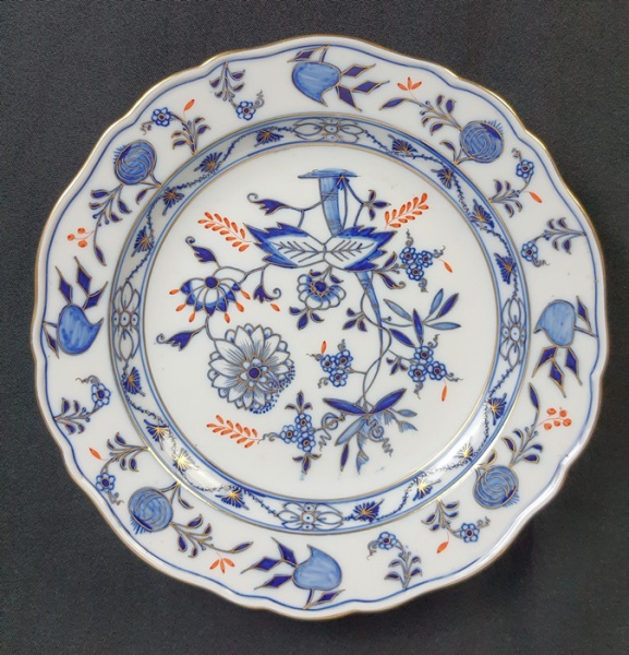 • Meissen - Prato em porcelana alemã, da manufatura de Meissen, esmaltado na cor azul, decorado com fios de ouro, sobre fundo branco, do padrão dito Cebolinha e bordas onduladas. Medindo: 21 cm.