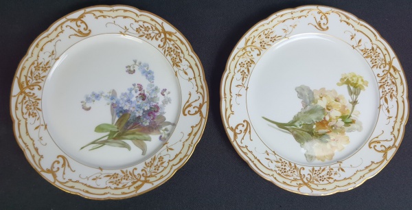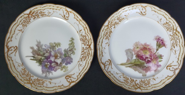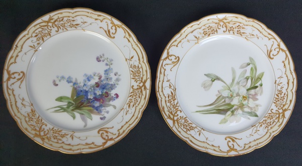 • KPM - Par de pratos em porcelana polonesa na cor branca, parte central com decoração floral e ricos detalhes de ouro em alto relevo, pintados à mão.  Medindo: 18 cm.