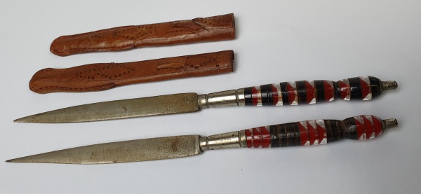 • Duas adagas/ punhais em aço com bainha em couro. Medindo: 15 cm e 16 cm.