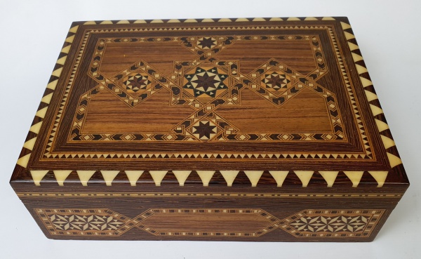 • Caixa porta joias em madeira marchetada. Medindo: 7,5 x 22 x 16 cm.