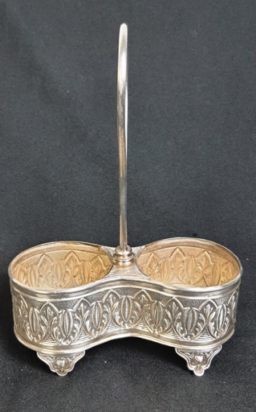 • Suporte para copos / galheteiro em metal prateado, cinzela. Medindo 23 x 16,5 cm.