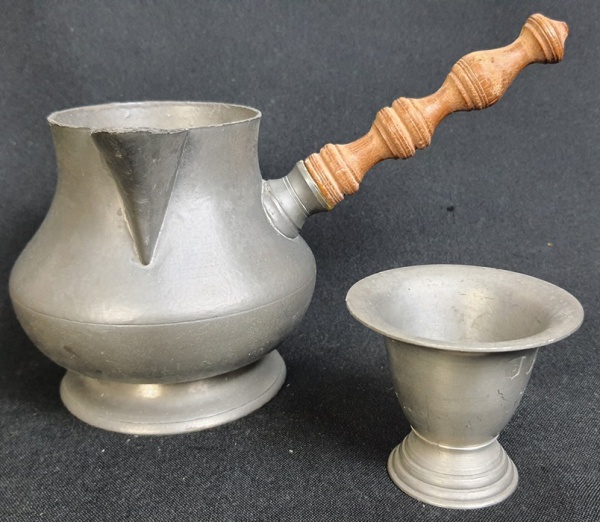 • Duas peças em estanho, sendo leiteira e copo. Medindo respectivamente. Marcado ao fundo. 10 x 20 cm e 6 x 6,7 cm.<br>