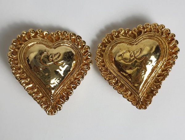• Christian Lacroix - Par de brincos franceses, no formato de coração. Medindo: 5 x 5 cm.