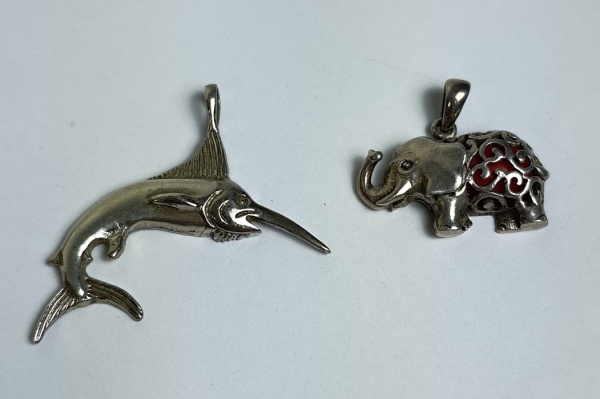 • Dois pingentes em prata de lei. Medindo: 2 x 3 cm  e 5 cm.