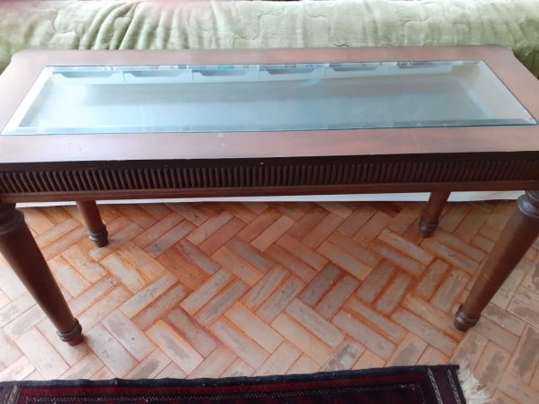 • Aparador em madeira nobre, com tampo central em em vidro bisotê. Medindo:  133 x 52 x 75 cm. RETIRADA EM COPACABANA.