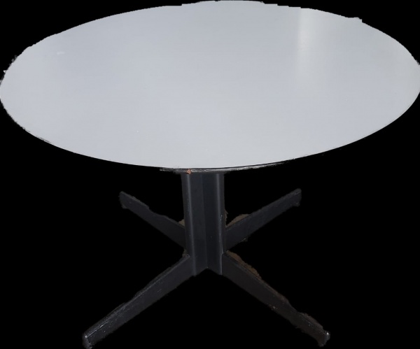 • Mesa redonda com tampo em madeira e base em ferro. Medindo: 75 x 122 cm. Retirada  no RIO COMPRIDO.