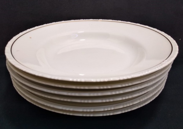 • Vista Alegre - 6 (Seis) pratos fundos em porcelana portuguesa, bordas com fio de ouro. Medindo: 24,5 cm.