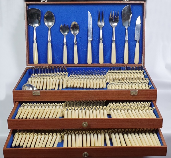 • Faqueiro em cromo 18-10, composto de 12 facas para peixe, 12 garfos para peixe, 12 colheres para café, 12 colheres para chá, 12 facas para sobremesa, 12 garfos para sobremesa, 12 colheres para sobremesa, 12 colheres para sopa, 12 garfos de mesa, 12 facas de mesa e 10 peças para servir. Total de 130 peças acondicionados em estojo.