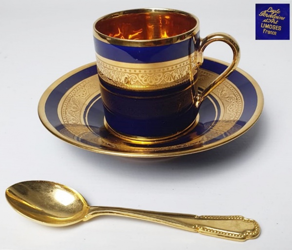 • Limoges - França - Xícara de coleção em porcelana francesa na cor azul cobalto com faixas e frisos à folha de ouro decoradas com volutas e arabescos, parte interna da xícara revestida a folha de ouro, marca da manufatura na base, acompanha colher em metal dourado, colher Medindo: 9 cm.