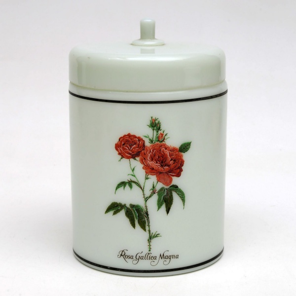 • Belíssimo frasco em vidro opalinado, adornado com flores "ROSA GALLICA MAGNA". Medindo: 16  x 12 cm.