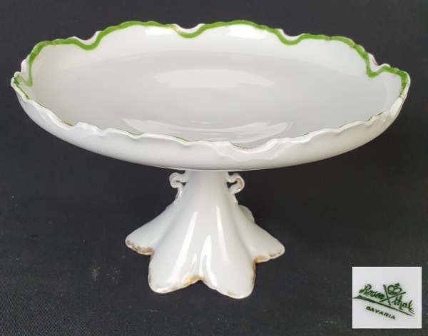 • Rosenthal, Bavaria - Elegante fruteira de pé alto em porcelana alemã na cor branca, com detalhes filetada a ouro, listra verde e bordas recortadas. Medindo: 10 x 23 cm