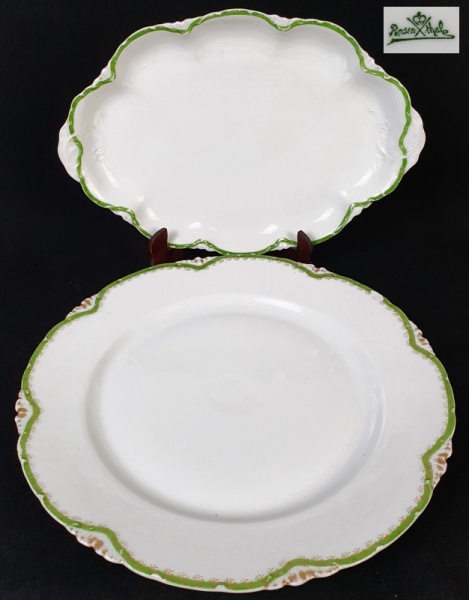 • Rosenthal, Bavaria - Duas travessas em porcelana alemã na cor branca, com detalhes filetada a ouro, listra verde e bordas recortadas, sendo uma redonda e outra oval. Medindo: 30 cm e 32 x 21 cm.