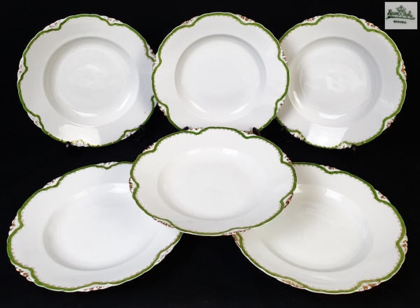 • Rosenthal, Bavaria - Seis pratos fundos em porcelana alemã na cor branca, com detalhes filetada a ouro, listra verde e bordas recortadas. Medindo: 4 x 25 cm