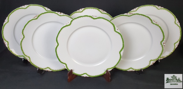 • Rosenthal, Bavaria - Seis pratos rasos em porcelana alemã na cor branca, com detalhes filetada a ouro, listra verde e bordas recortadas. Medindo: 25 cm
