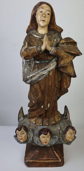 • Arte Sacra - Imagem em madeira entalhada e policromada,  representando Nossa Senhora da Conceição. Medindo: 52 cm.