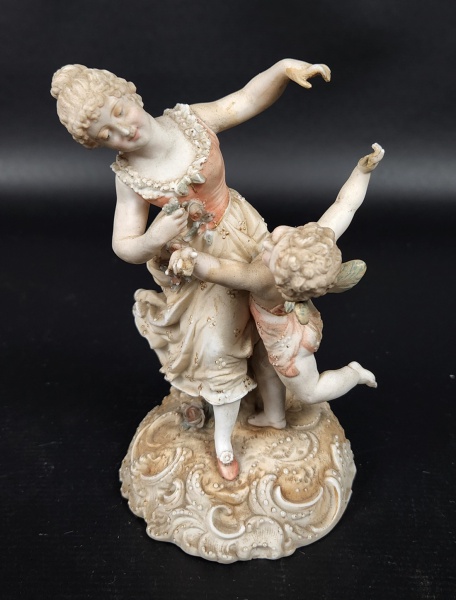 • Escultura em porcelana esmaltada e policromada representando jovem e querubim, com ricos detalhes. Manufatura no verso. Medindo: 14 x 9 cm