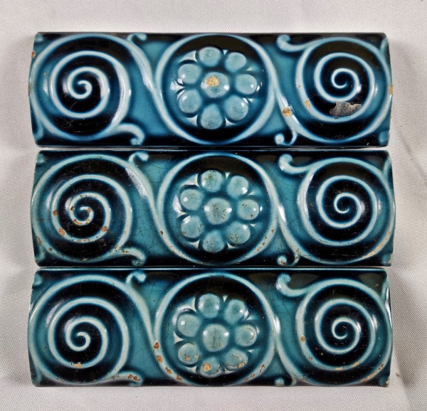 • ALEMANHA (CIRCA - 1900) - Três azulejos/ barras art nouveau, esmaltadas na cor azul com decoração em relevo. Medindo: 5 x 15 cm.