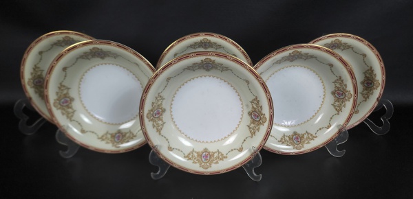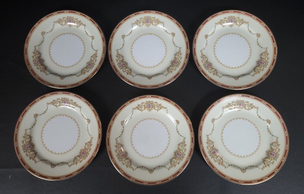 • NORITAKE, Nippon Toki Kaisha - Seis pratos fundos em porcelana japonesa esmaltada nas cores branca e creme, decoração de ramos flores e volutas, bordas filetadas a ouro. Manufatura no verso. Medindo: 4 x 19 cm