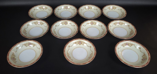 • NORITAKE, Nippon Toki Kaisha - Onze tigelas em porcelana japonesa esmaltada nas cores branca e creme, decoração de ramos flores e volutas, bordas filetadas a ouro. Manufatura no verso. Medindo: 3 x 14 cm.