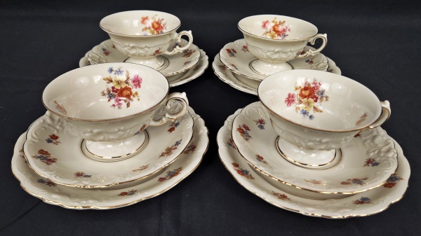 • KPM - Kristen Porzellan-Manufaktur, Waldenburg, Polônia (Fundada em 1831 por Carl Kristen) - Quatro trios para chá em porcelana polonesa esmaltada na cor marfim com rica decoração de flores policroma, detalhes em alto relevo e filetes em ouro. Sendo 4 xícaras de chá com seus pires e 4 pratos para sobremesa. Manufatura no verso. Prato mede: 17,5 cm.