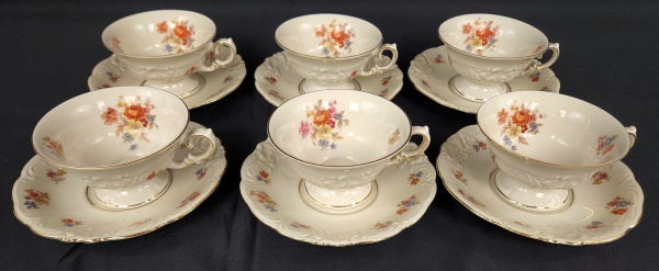 • KPM - Kristen Porzellan-Manufaktur, Waldenburg, Polônia (Fundada em 1831 por Carl Kristen) - Seis xícaras para chá em porcelana polonesa esmaltada na cor marfim com rica decoração de flores policroma, detalhes em alto relevo e filetes em ouro. Manufatura no verso.