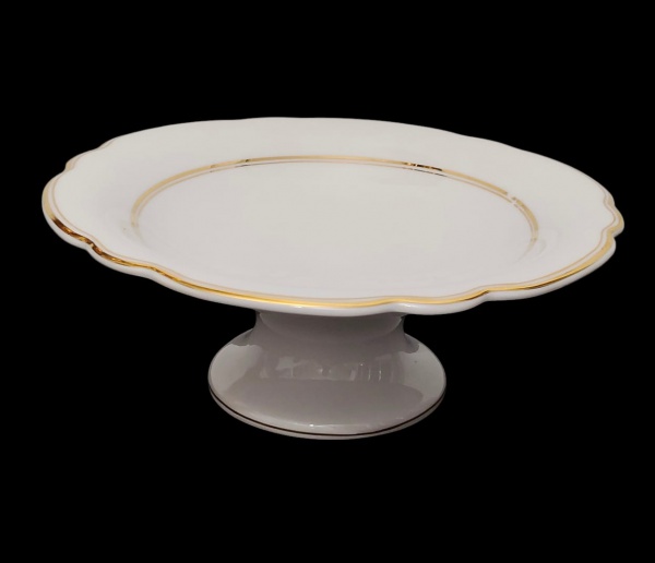 • Real. Fruteira em porcelana nacional esmaltada na cor branca, com bordas onduladas e filetes em ouro. Medidas: 9,5 x 26,5 cm. Em ótimo estado.