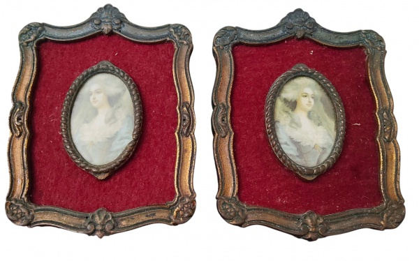• Par de quadros antigos em metal com acabamento em relevo, fundo revestido em veludo na cor vermelha, contendo miniaturas ovais com retratos femininos ao centro. Verso forrado e com suporte para fixação. Medidas: 17 x 13 cm.