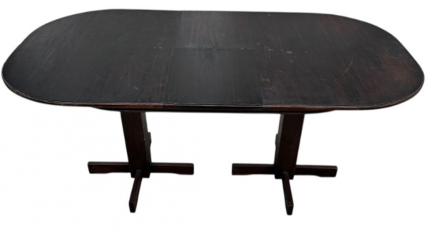 • Antiga mesa de madeira, de formato oval, com tampa extensível  e pés estruturais retos. Medidas: 178,5 cm (aberta) / 142 cm (fechada) x 95 x 79,5 cm. Necessita de polimento/lustro, apresentando marcas de uso compatíveis com o tempo.